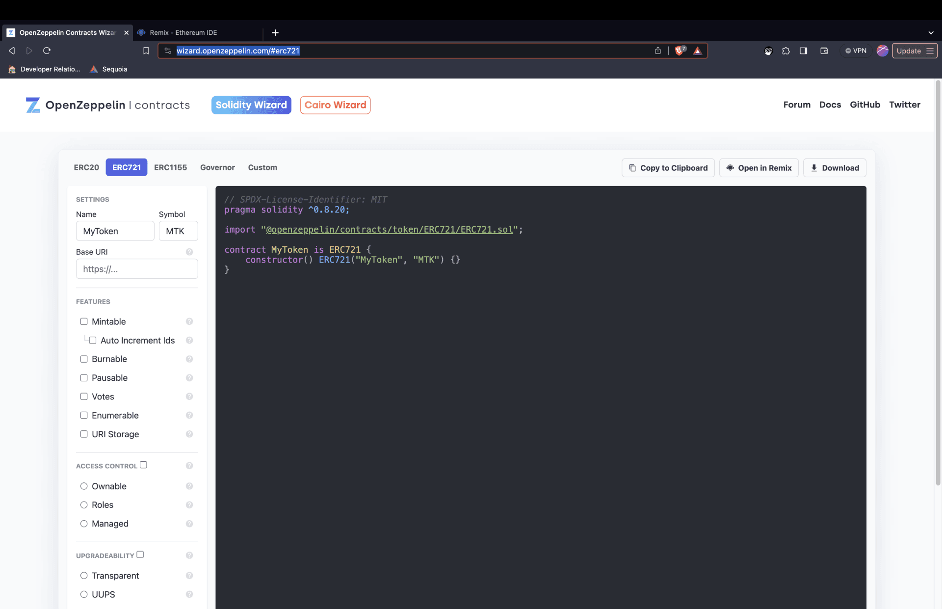 We again come across the question of how to deploy a ERC-721 token on the blockchain. Since we have access to the ERC-721 contract interface, there is nothing stopping us from writing our own implementation of an ERC-721 token. However, if you recall the deployment section of the ERC-20 chapter, then you know that we were able to use OpenZeppelin's Contract Wizard to autogenerate our own ERC-20 contract. Likewise, OpenZeppelin's Contract Wizard also allows to create ERC-721 tokens on the fly. For the rest of this section, we will look at just that!
